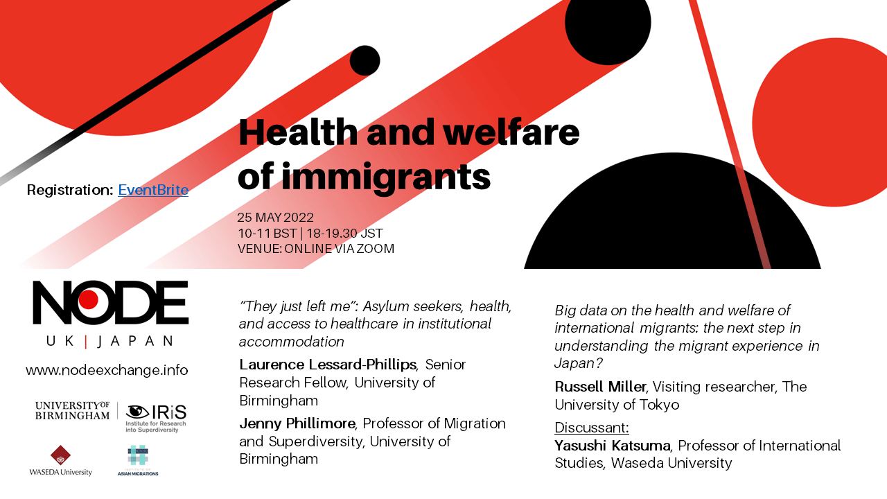 We are delighted to announce the next NODE UK|Japan webinar on the health and welfare of immigrant. NODE UK|Japan network is led by the University of Birmingham’s Institute for Research into Superdiversity and Waseda University’s Institute for Asian Migrations. Initially funded by the Economic and Social Research Council and the Japan Foundation, NODE brings together social sciences, arts and humanities academics from the UK and Japan to develop new knowledge and insight about migration-driven socio-demographic change.