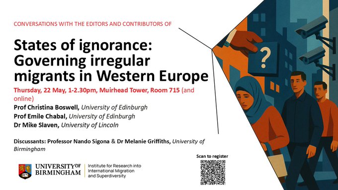 Thursday 22nd May 2-3:30pm, Muirhead Tower 715 and online (register via Eventbrite). This hybrid roundtable discusses the new book which focuses on one of the most complex and contested social issues of our day: the governance of irregular migrants. The author trace the evolution of state monitoring and control of irregular migrants from the 1960s to the present day to develop a theory of ‘state ignorance’, to which Birmingham scholars will critically engage in a lively and productive debate.