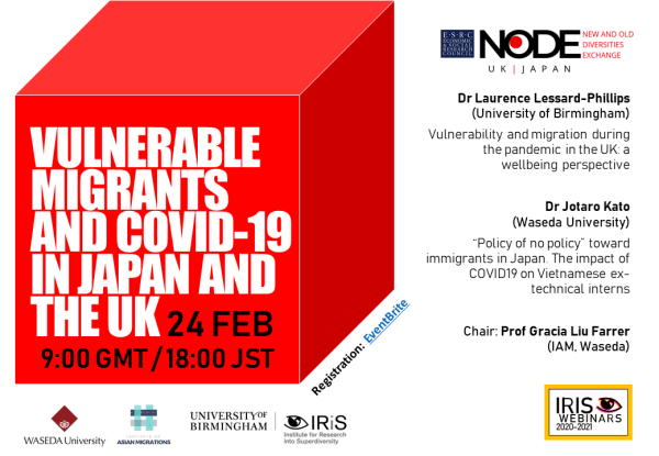 This is the video recording of the first NODE UK|Japan webinar on vulnerable migrants and Covid-1p with Dr Laurence Lessard-Phillips (IRiS, University of Birmingham) and Dr Jotaro Kato (IAM, Waseda). The webinar is chair by professor Gracia Liu Farrer, director of the Institute of Asian Migrations (IAM) at Waseda University. https://www.youtube.com/watch?v=y4TEe15TAPY