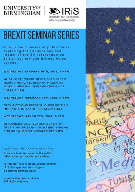 Next year IRiS is showcasing its current work on Brexit, migration and citizenship in three public seminars: 10 January, 3-4pm, Muirhead Tower 714/5: What next? Where next? Post-Brexit fears among secondary migrant Somali Muslims in Birmingham by Dr Chris Allen 7 February, 3-4pm, Muirhead Tower 112: Beyond Brexit Britain: Older British migrants in Spain by Dr Kelly... Continue Reading →