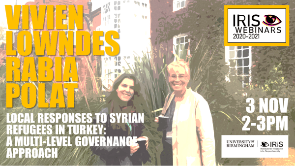 3 November, 2-3pm (UK time) via Zoom. Registration via Eventbrite In this webinar organised by the University of Birmingham’s Institute for Research into Superdiversity (IRiS), Vivien Lowndes and Rabia Polat present their work on the governance of Syrian refugees in Turkey This talk investigates local government responses to the Syrian refugee situation in Turkey, situating... Continue Reading →